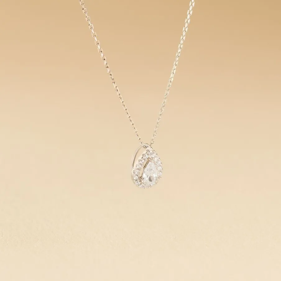 Collier Or Blanc 375/1000 Solitaire Oxyde De Zirconium Central Forme Poire Entourage Oxydes De Zirconium 42cm