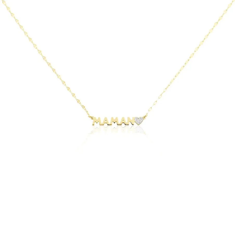 Collier Or Jaune 375/1000 Message Maman Lettres Decoupees + Coeur Plein Glitter Argente Maille Lumina 40+2cm