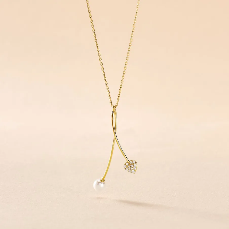 Collier Or Jaune 375/1000 C艙ur Entrelace Pavage Oxydes De Zirconium Et Perle De Culture 4/4.5mm 43cm