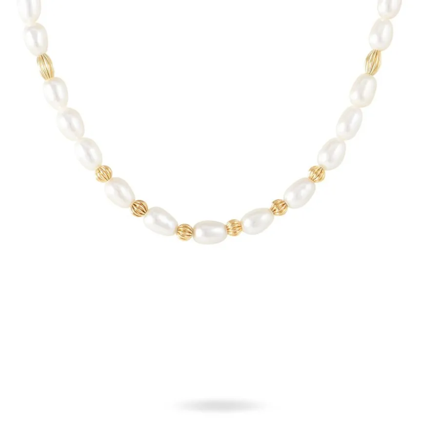 Collier Or Jaune 375/1000 Perles De Culture Grain De Riz + Boules Or 5.5/6mm 45cm