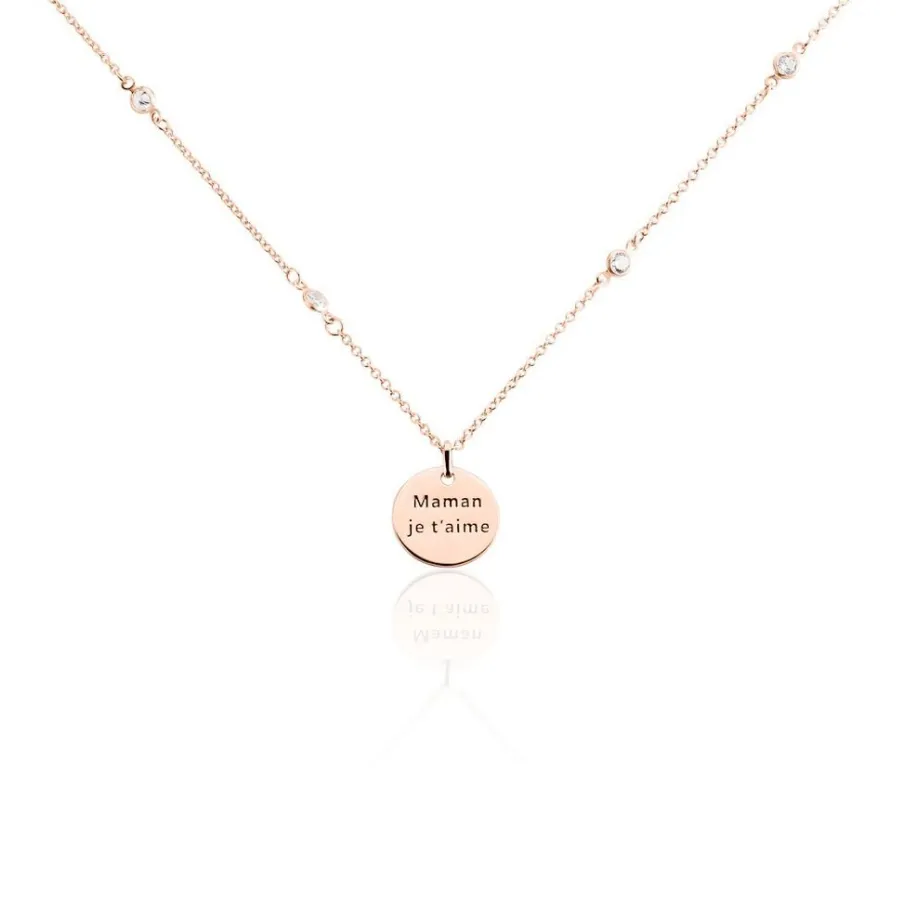 Collier Argent Rose 925/1000 Pastille Gravée Maman Je T’aime Oxydes De Zirconium Serti Clos Maile Forçat 42+3cm