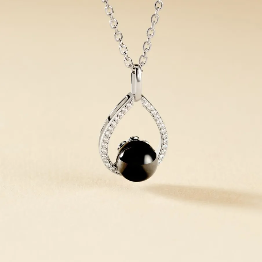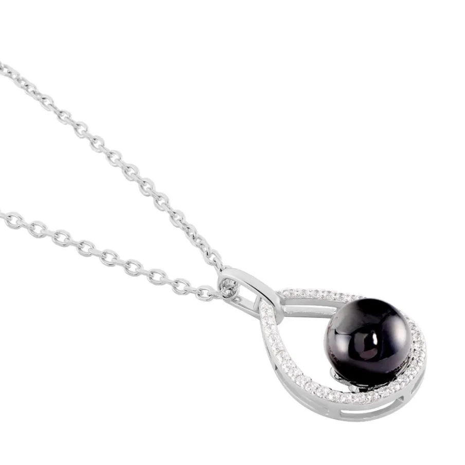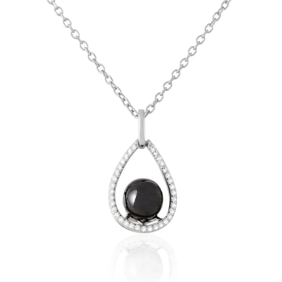 Collier Argent Blanc 925/1000 Forme Goutte Pavage Oxydes De Zirconium Boule Ceramique Noire 45cm