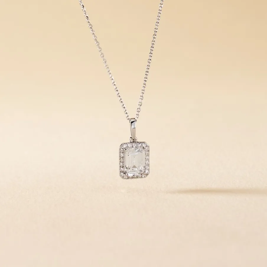 Collier Or Blanc 375/1000 Oxyde De Zirconium Taille Emeraude Entourage Oxydes De Zirconium 40+2cm