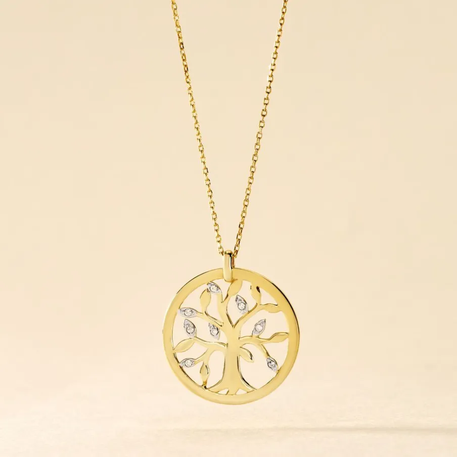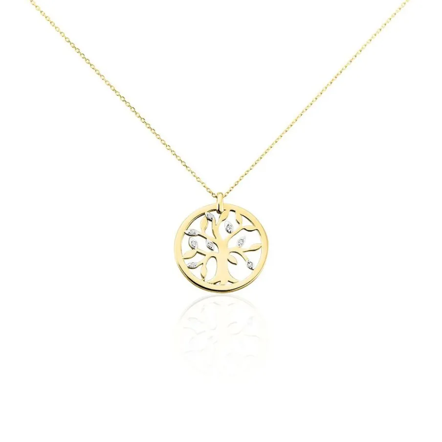 Collier Or Jaune 375/1000 Cercle Ajouré Arbre De Vie Pavage Diamants Maille Forçat 40+2cm