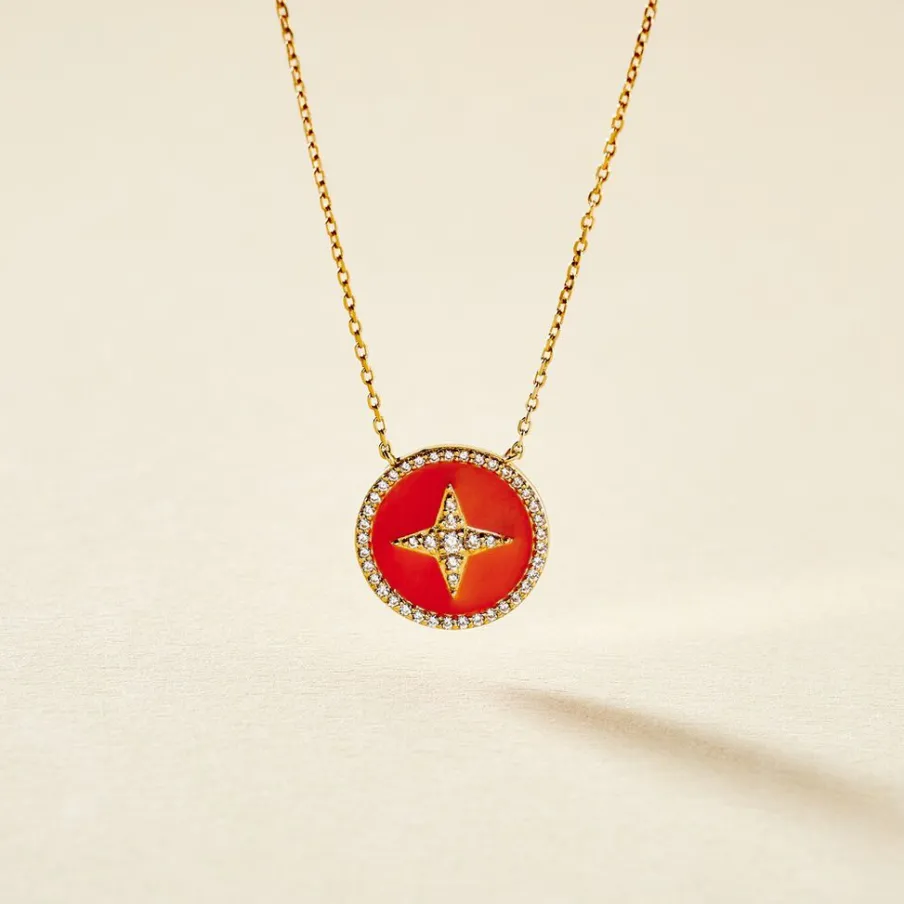 Collier Or Jaune 375/1000 Pastille Email Corail Etoile Du Berger Pavage Oxyde De Zirconium Chaine Maille Forcat 40+2cm