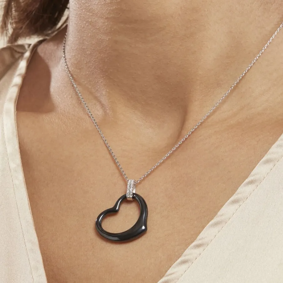 Collier Argent Blanc 925/1000 Ceramique Noire Et Oxydes De Zirconium Coeur Cote 42cm