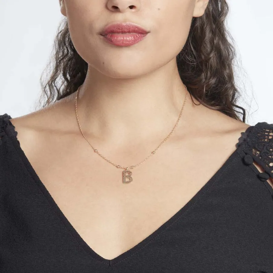 Collier Plaque Or Jaune Lettre B Martelee Et Petites Boules Chaine Maille Forcat Longueur 45cm