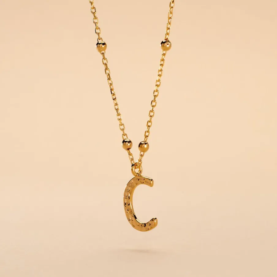 Collier Plaque Or Jaune Lettre C Martelee Et Petites Boules Chaine Maille Forcat Longueur 45cm