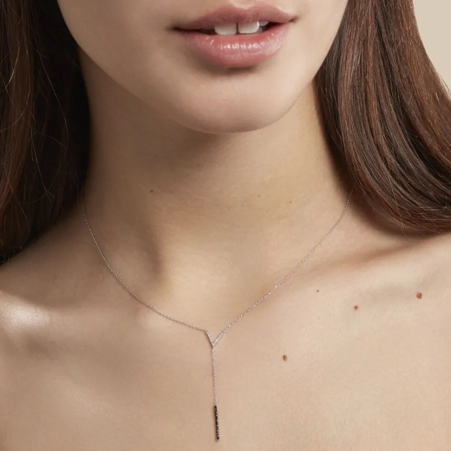 Collier Or Blanc 375/1000 Forme V Cravate Diamants Noirs Et Diamants Blancs 42cm