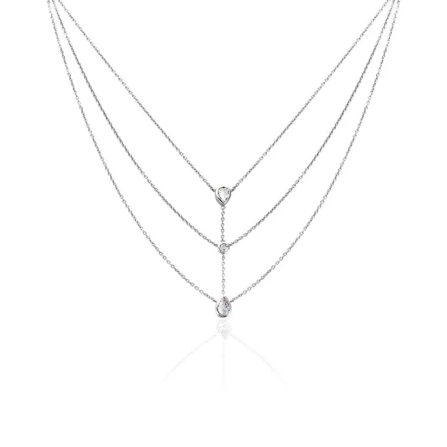 Collier Argent Blanc 925/1000 Triple Chaine Goutte Et Cercle Oxydes De Zirconium Maille Jaseron 38+2cm