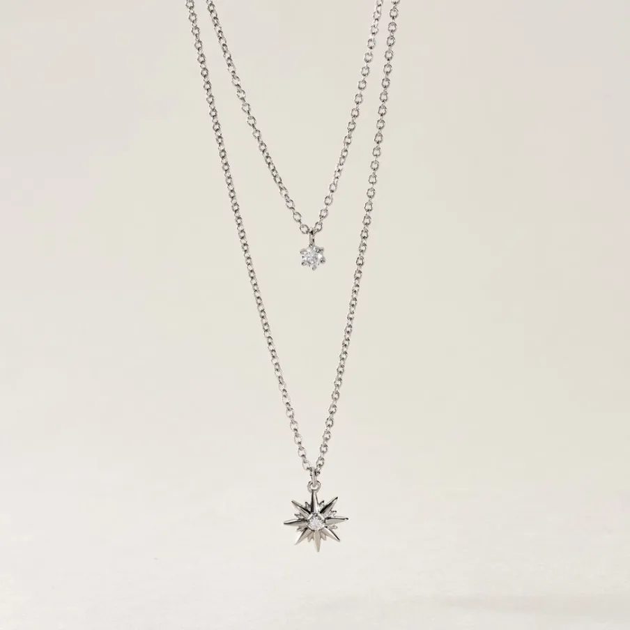 Collier Double Chaines Argent 925/1000 shone Motif Etoile Micro Setting Oxydes De Zirconium Maille Forçat 45cm