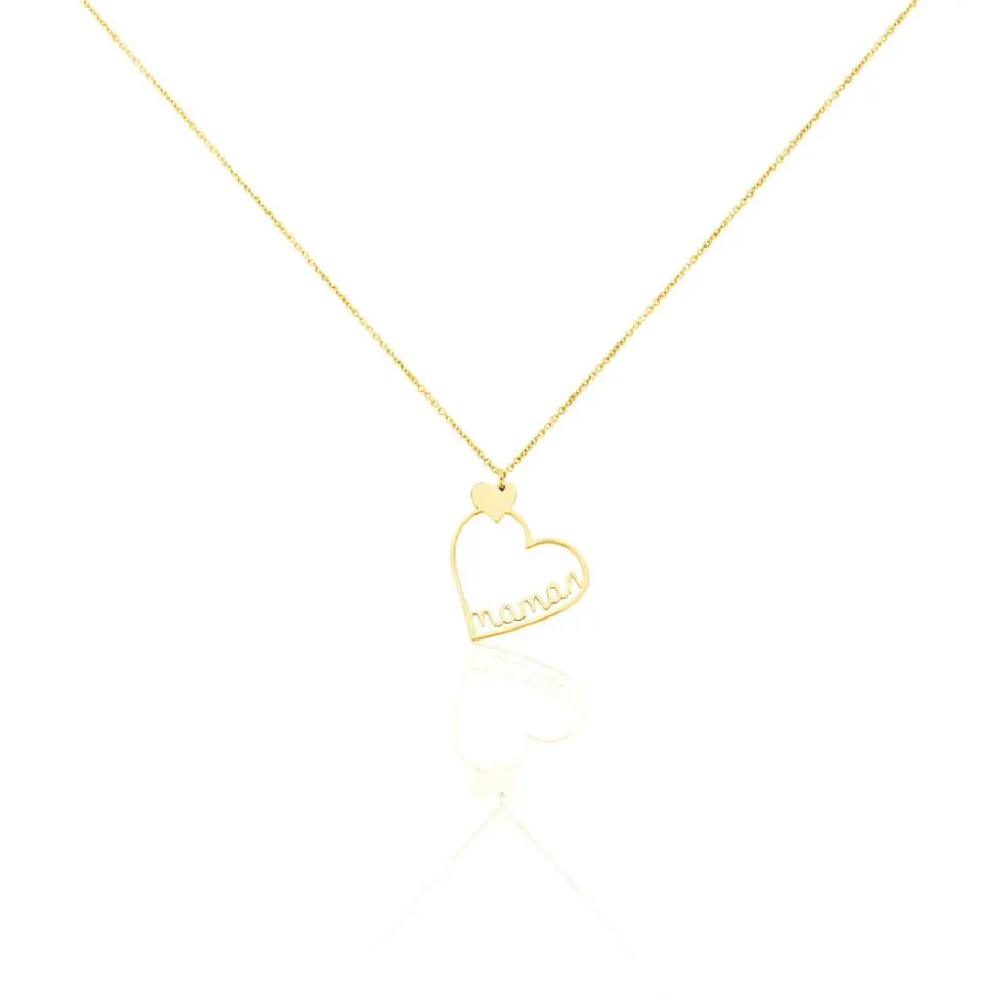 Collier Or Jaune 375/1000 C艙ur Penche Ajoure + Petit C艙ur Plein Message Maman Maille Jaseron 42cm