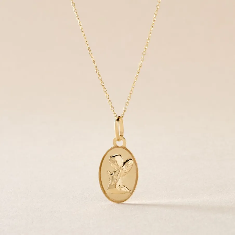Pendentif Or Jaune 375/1000 Ovale Motif Ange A Genoux
