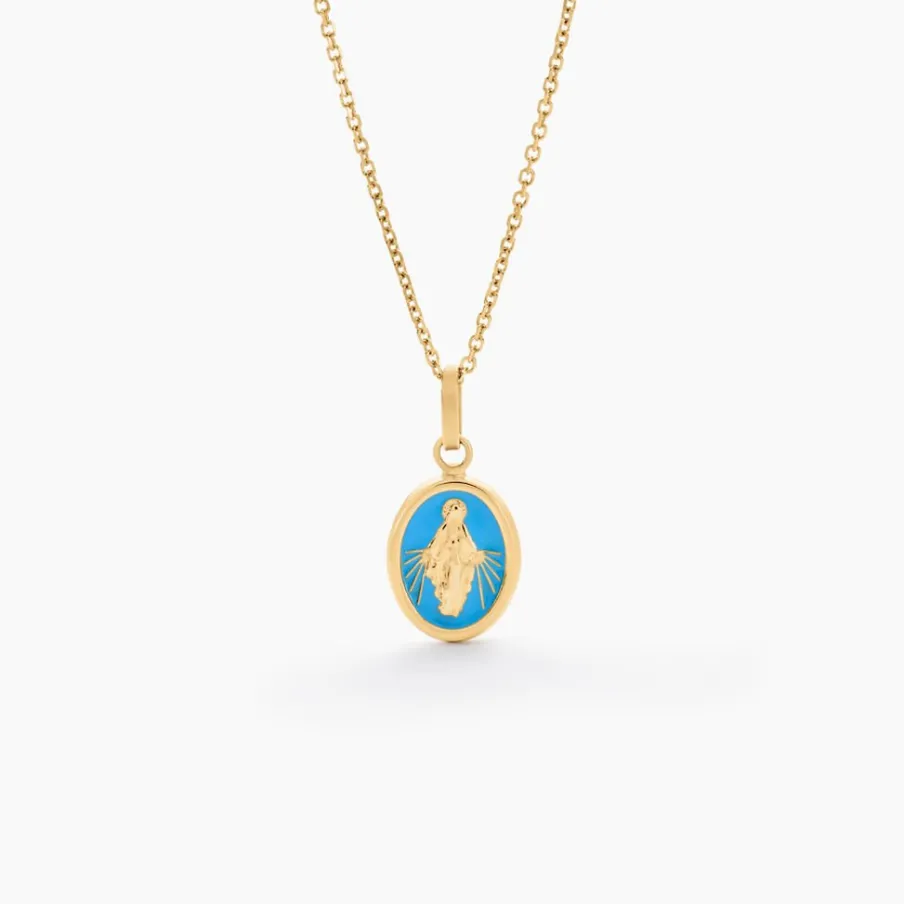 Pendentif Or Jaune 375/1000 Vierge Miraculeuse Ovale Email Bleu 1.2cm