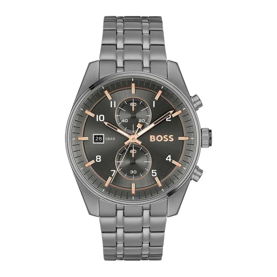 Montre Boss Skytraveller Acier Gris Ronde Quartz Chronographe 44mm Fond Noir Bracelet Acier Gris Maillons 1514153