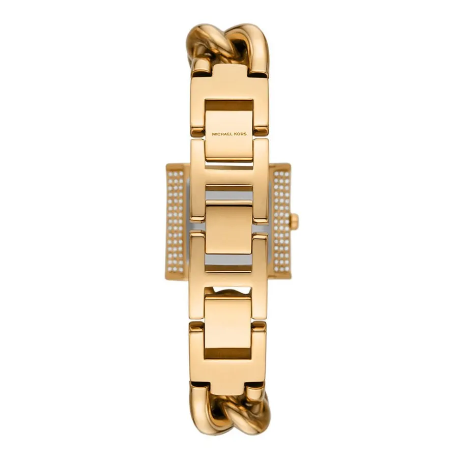 Montre Michael Kors Chain Lock Acier Dore Carre Quartz 25mm Lunette Strassee Fond Dore Bracelet Acier Dore Mk4711