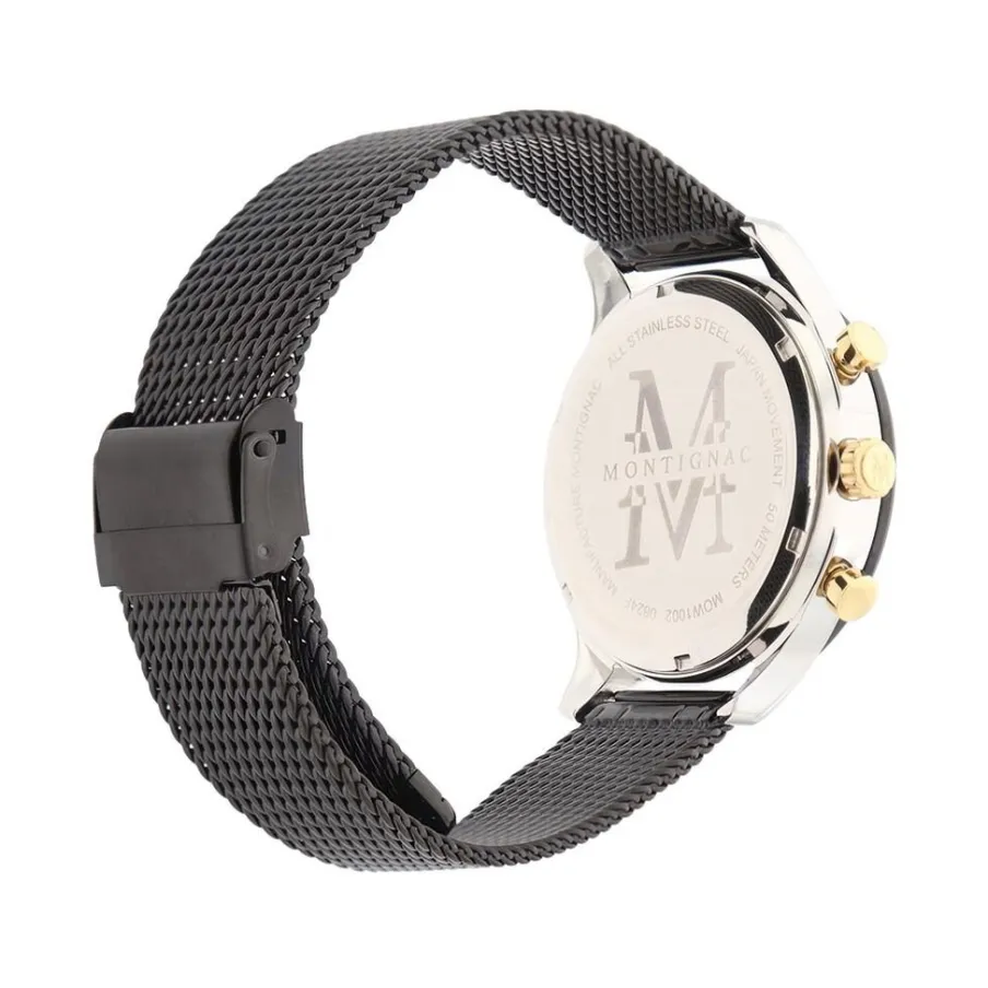 Montre Montignac Round Acier Argente Ronde Quartz 42mm Fond Vert Lunette Noire Bracelet Acier Noir Milanais Mow1000