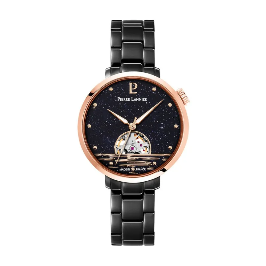 Montre Pierre Lannier Australe Acier Noire Ronde Automatique 35mm Fond Noir Lunette Rose Bracelet Acier Inoxydable Noir 149k739