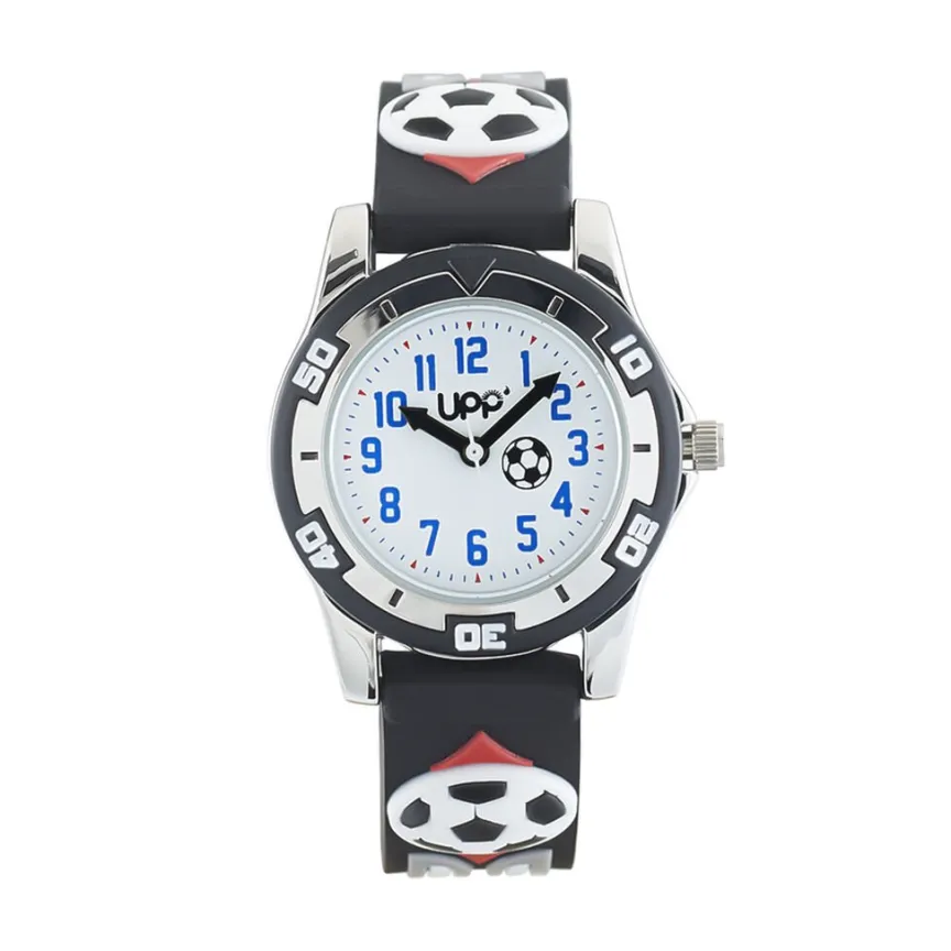 Montre Upp Ballon Alliage Argenté Ronde Quartz 28mm Fond Blanc Et Bracelet Plastique Noir Cl217