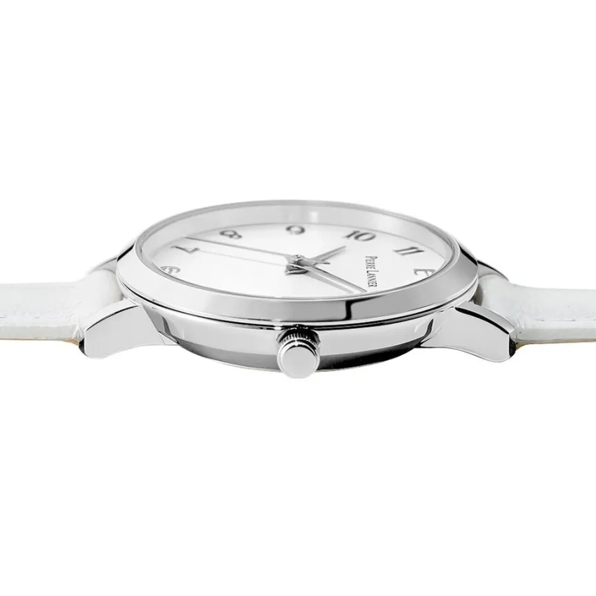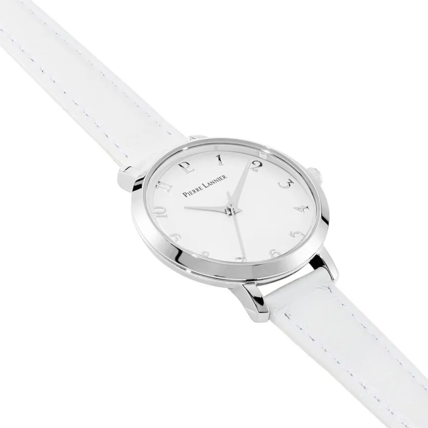 Montre Pierre Lannier Chouquette Acier Argenté Rond Quartz 30mm Fond Blanc Bracelet Cuir Blanc 046h600