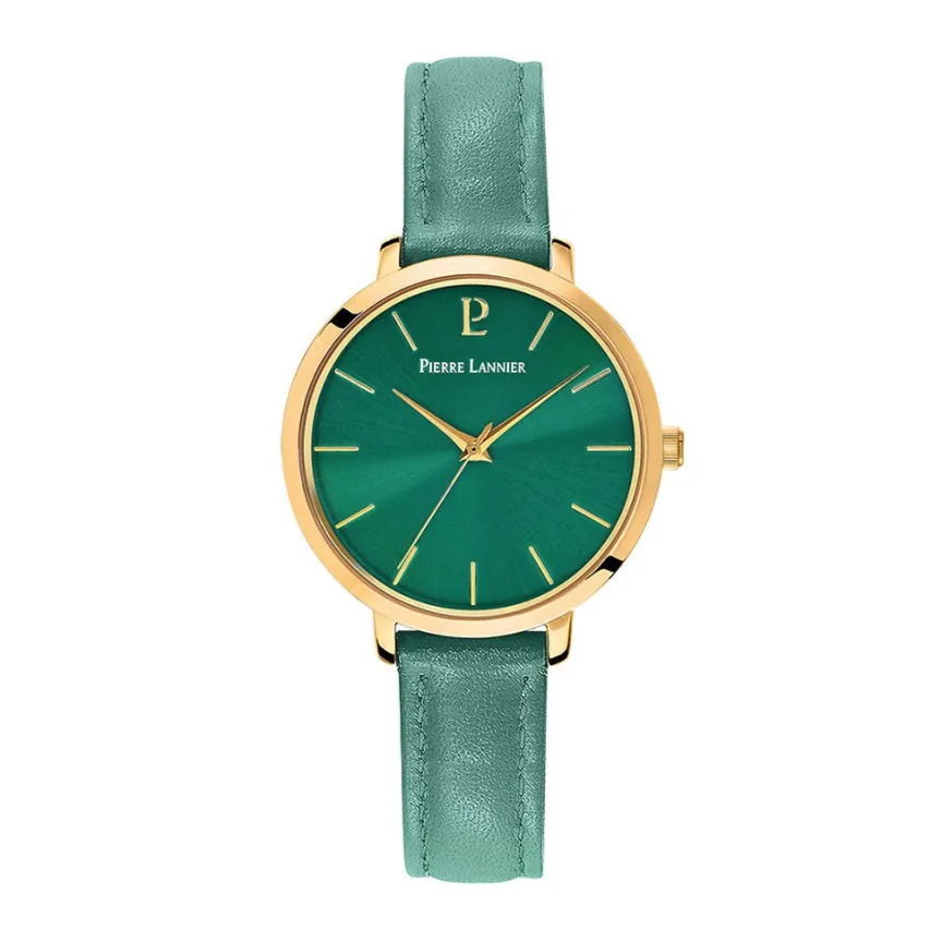 Montre Pierre Lannier Chouquette Acier Doré Rond Quartz 30mm Fond Vert Bracelet Cuir Vert 038j577