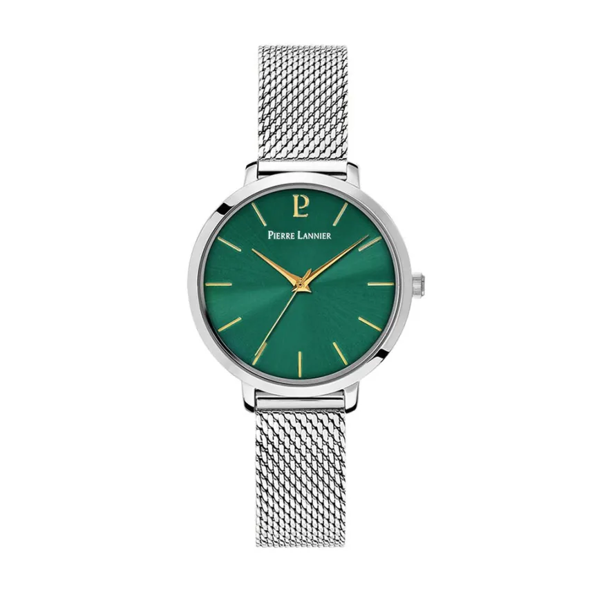 Montre Pierre Lannier Chouquette Acier Argente Ronde Quartz 30mm Fond Vert Bracelet Acier Inoxydable Argente Milanais 046h671