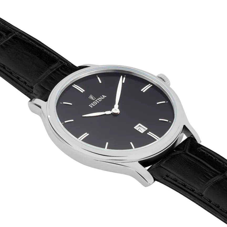 Montre Festina Classics Acier Blanc Ronde Quartz 39mm Fond Noir Bracelet Cuir Noir F167455