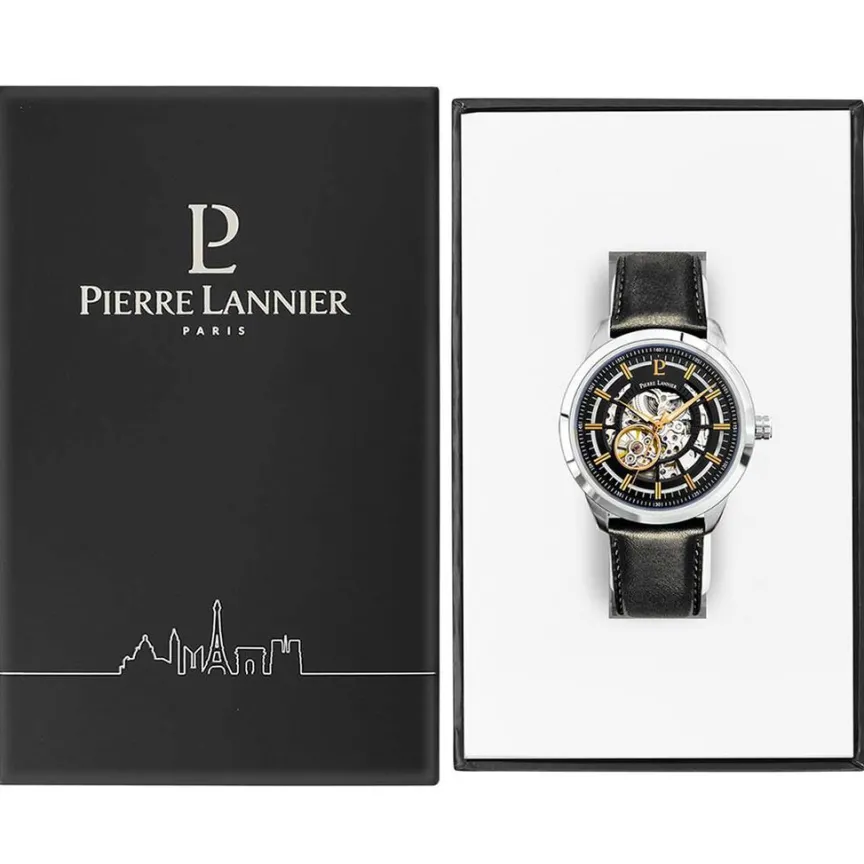Montre Pierre Lannier Collection Automatique Acier Argenté Ronde Automatique 44mm Fond Noir Bracelet Cuir Noir 329f133