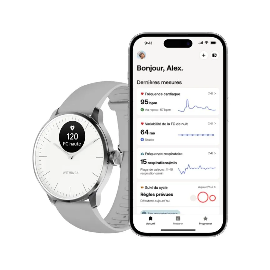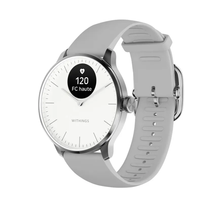 Montre Withings Scanwatch Light Acier Inoxydable Argente Ronde Connectee 37mm Fond Blanc Bracelet Silicone Gris Wswlwhite