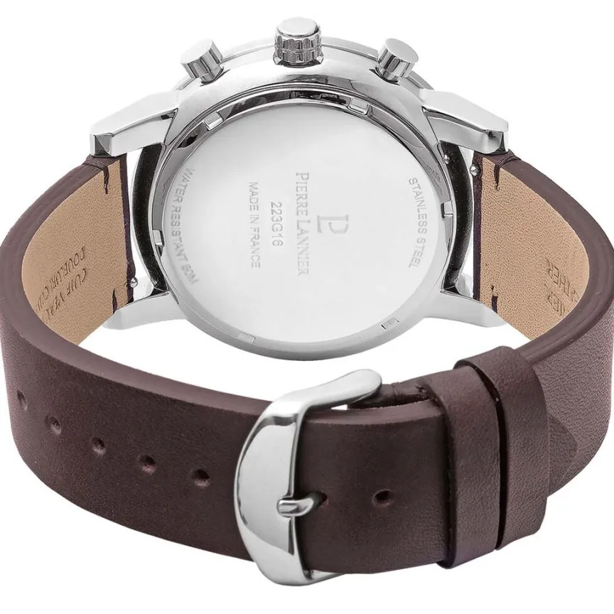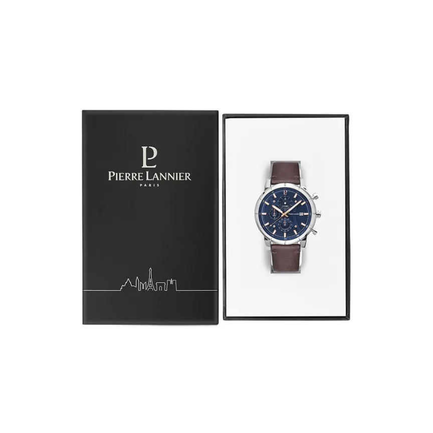 Montre Pierre Lannier Criterium Acier Blanc Ronde Quartz 45mm Fond Bleu Bracelet Cuir Brun 223g164