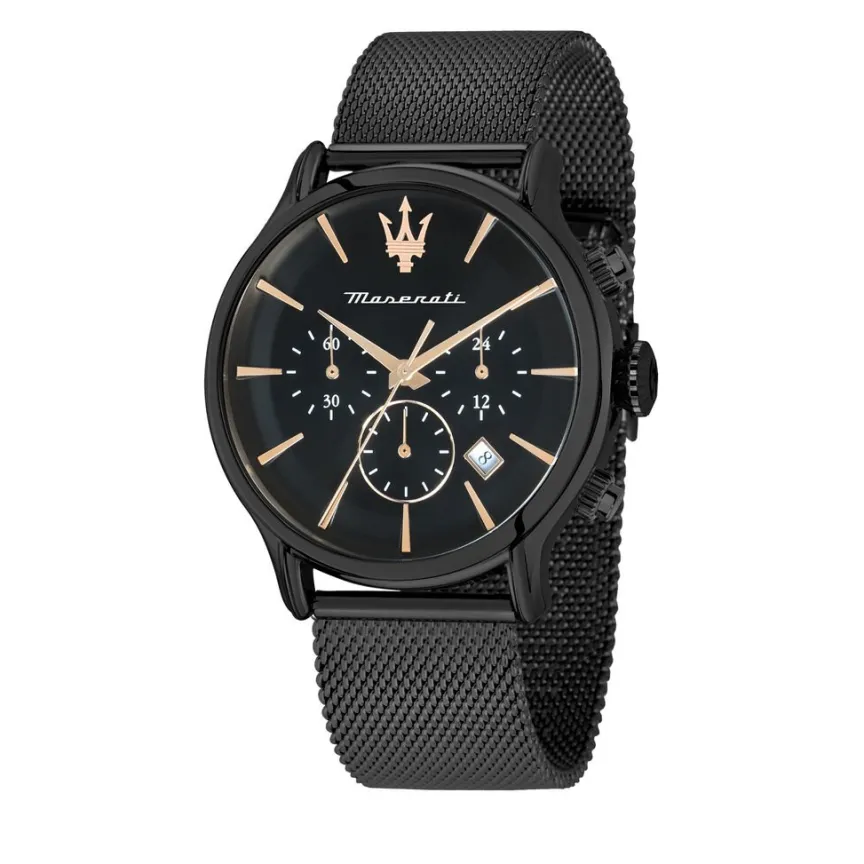 Montre Maserati Epoca Pvd Noir Ronde Quartz Chronographe 42mm Fond Noir Bracelet Milanais Métal Noir R8873618013