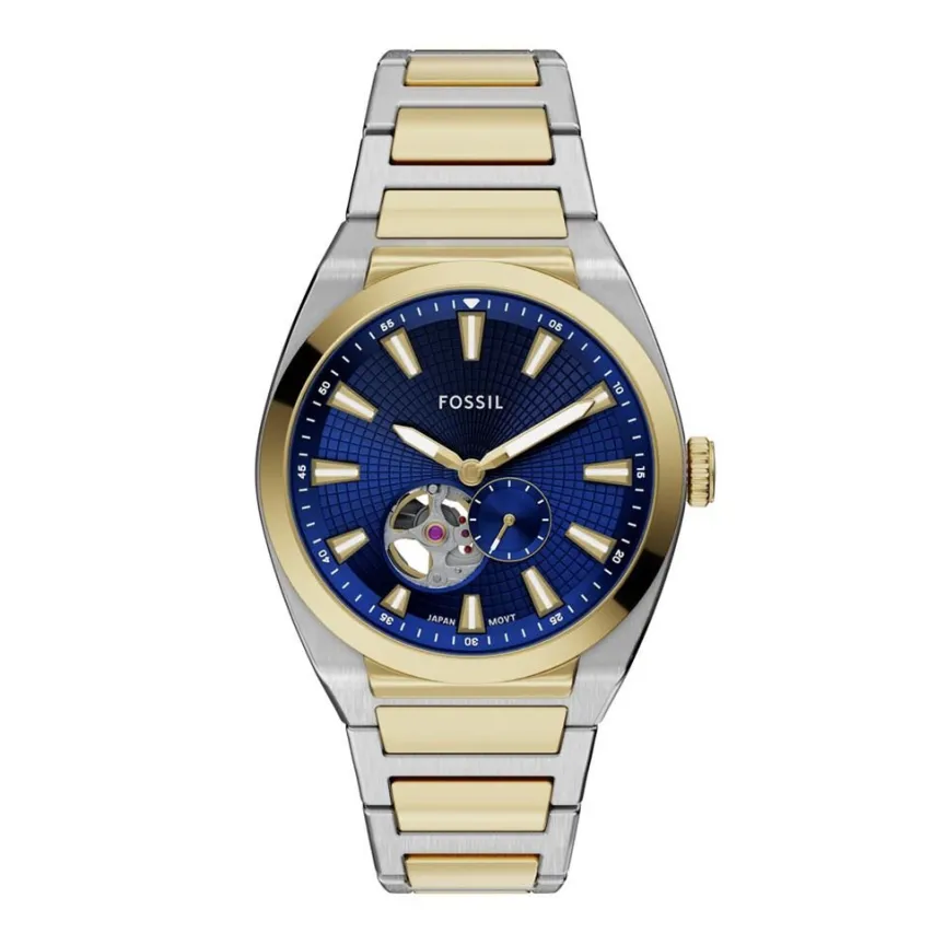 Montre Fossil Everett Automatic Acier Inoxydable Bicolore Doré/Blanc Automatique Ronde 42Mm Fond Bleu Coeur Ouvert Bracelet Acier Inoxydable Bicolore Doré/Blanc Me3275
