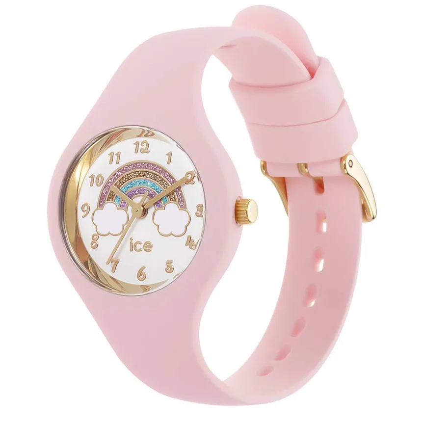Montre Ice Watch Fantasia Silicone Rose Ronde Quartz 29.45mm Fond Blanc Motif Arc En Ciel Multicolore Lunette Rose Bracelet Silicone Rose 018424