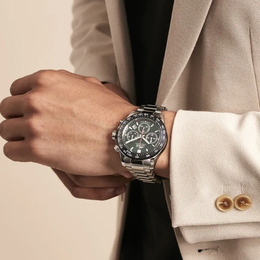 Montre Lotus Freedom Collection Acier Argente Ronde Quartz Chronographe 43.5mm Lunette Noire Fond Vert Bracelet Acier 18912/5