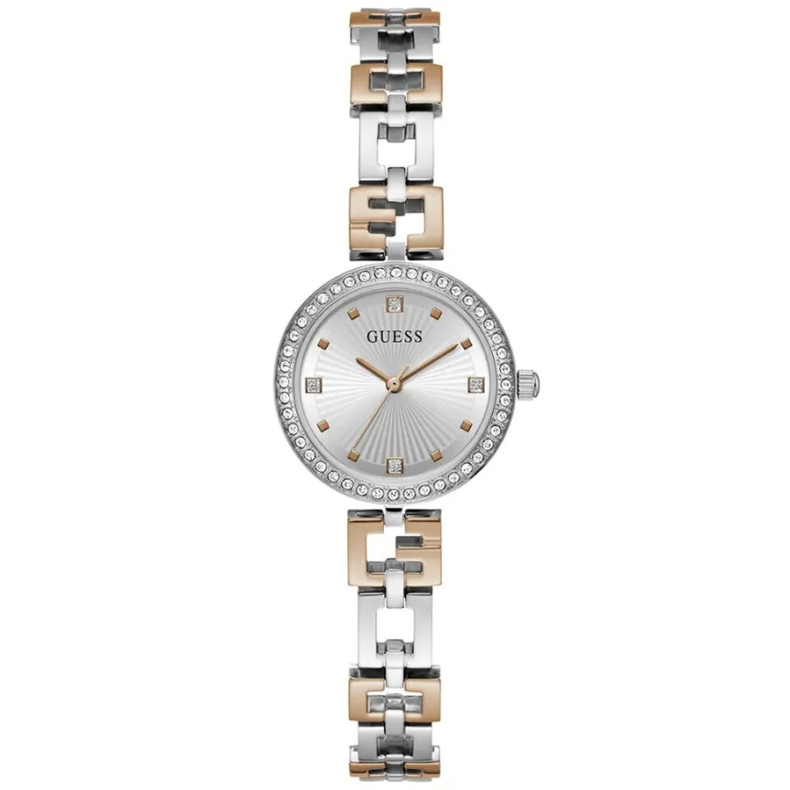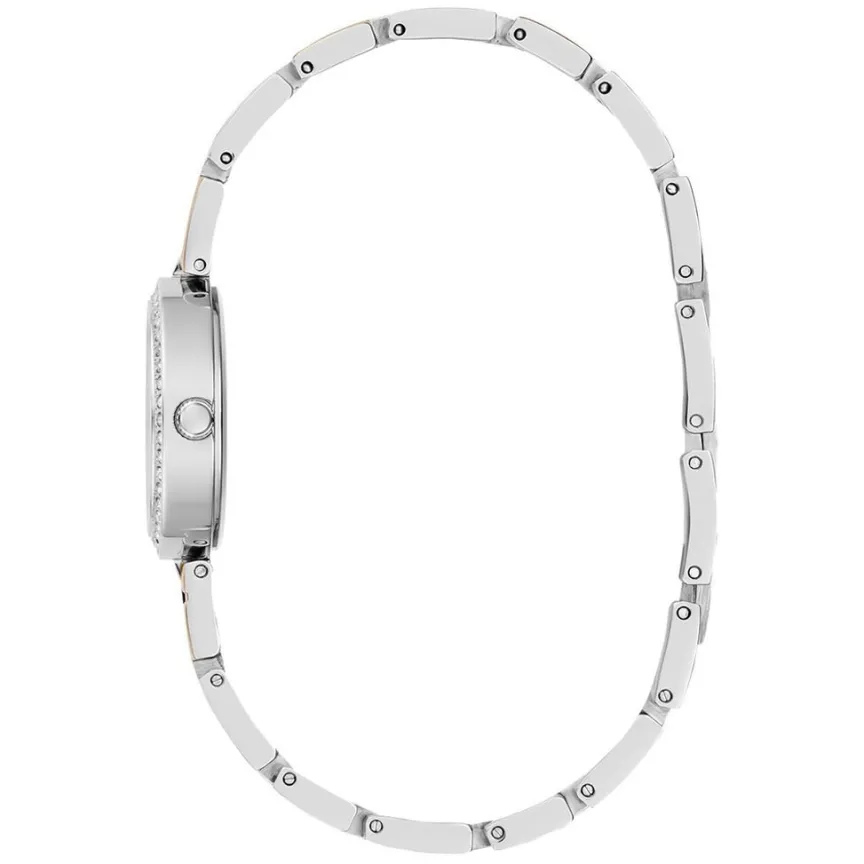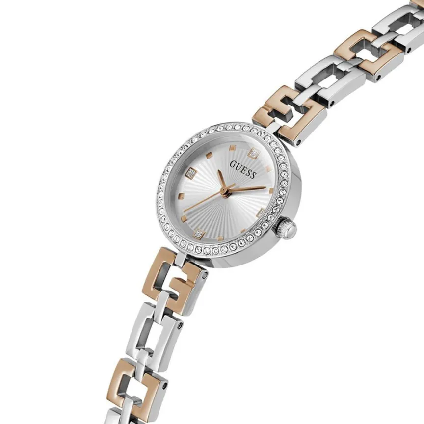 Montre Guess Lady G Acier Argenté Ronde Quartz 26mm Lunette Strassée Fond Argenté Bracelet Acier Bicolore Blanc Rose Gw0656l2