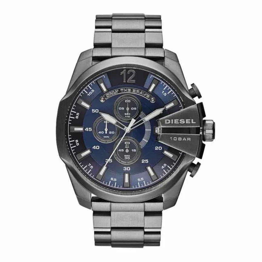 Montre Diesel Mega Chief Acier Gris Ronde Quartz Chronographe 51mm Fond Bleu Bracelet Acier Gris Dz4329
