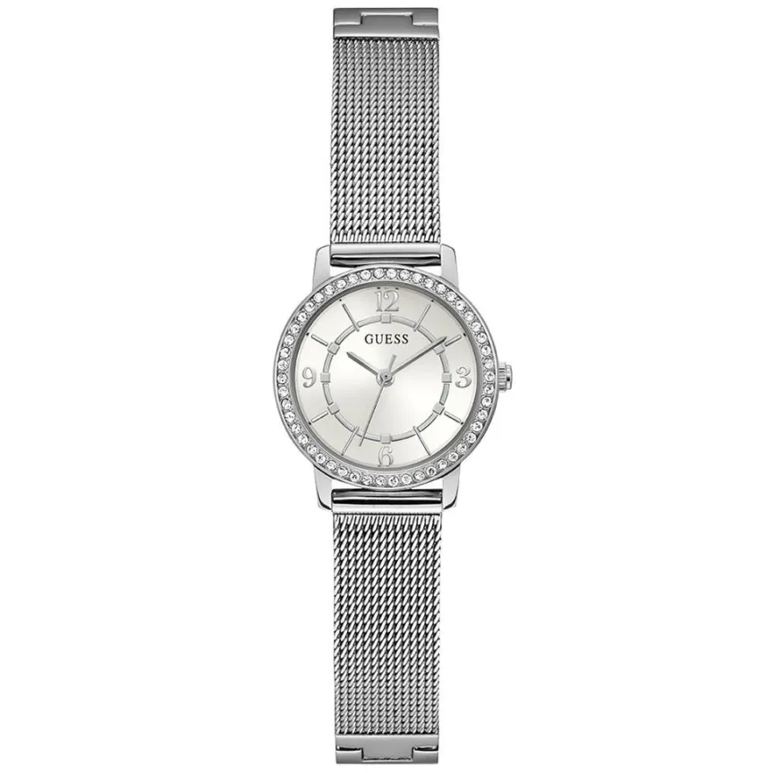 Montre Guess Melody Acier Argenté Ronde Quartz 28mm Lunette Strass Fond Blanc Bracelet Maille Milanaise Acier Argenté Gw0534l1