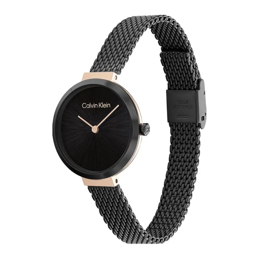 Montre Calvin Klein Minimalistic T Bar Acier Noir Ronde Quartz 28mm Fond Noir Bracelet Maille Milanaise Acier Noir 25200084