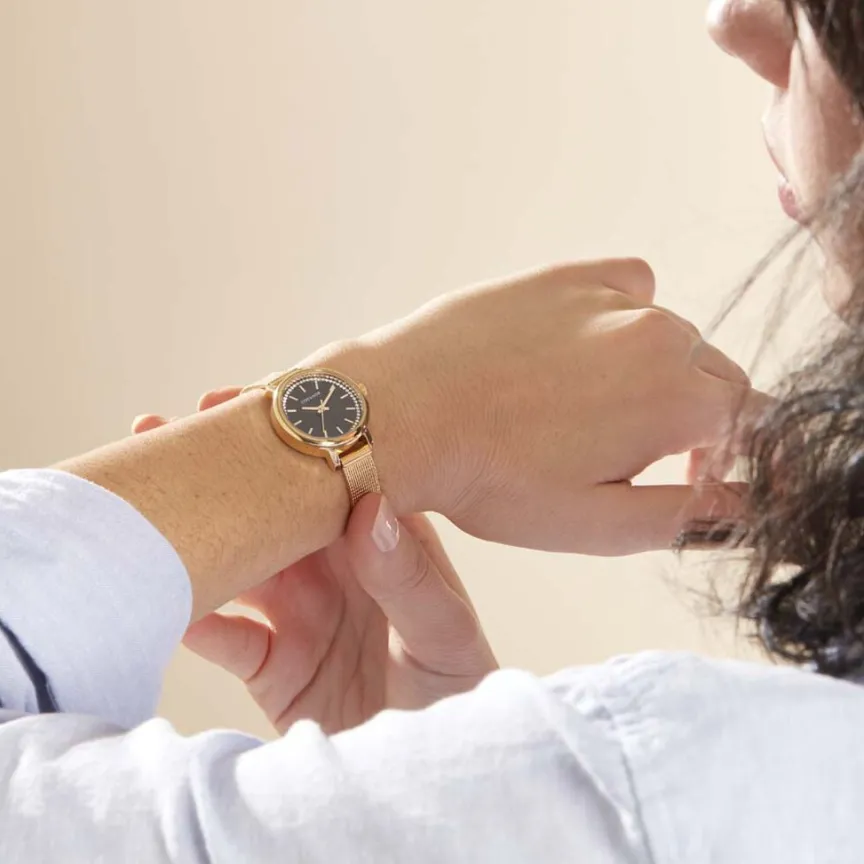 Montre Codhor Nerine Alliage Doré Ronde Quartz 27mm Fond Noir Et Strass Bracelet Milanais Acier Doré Wbj0085-010