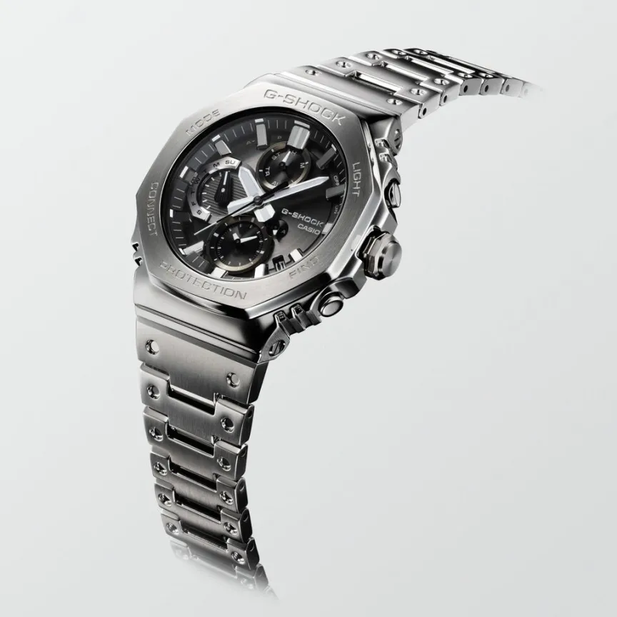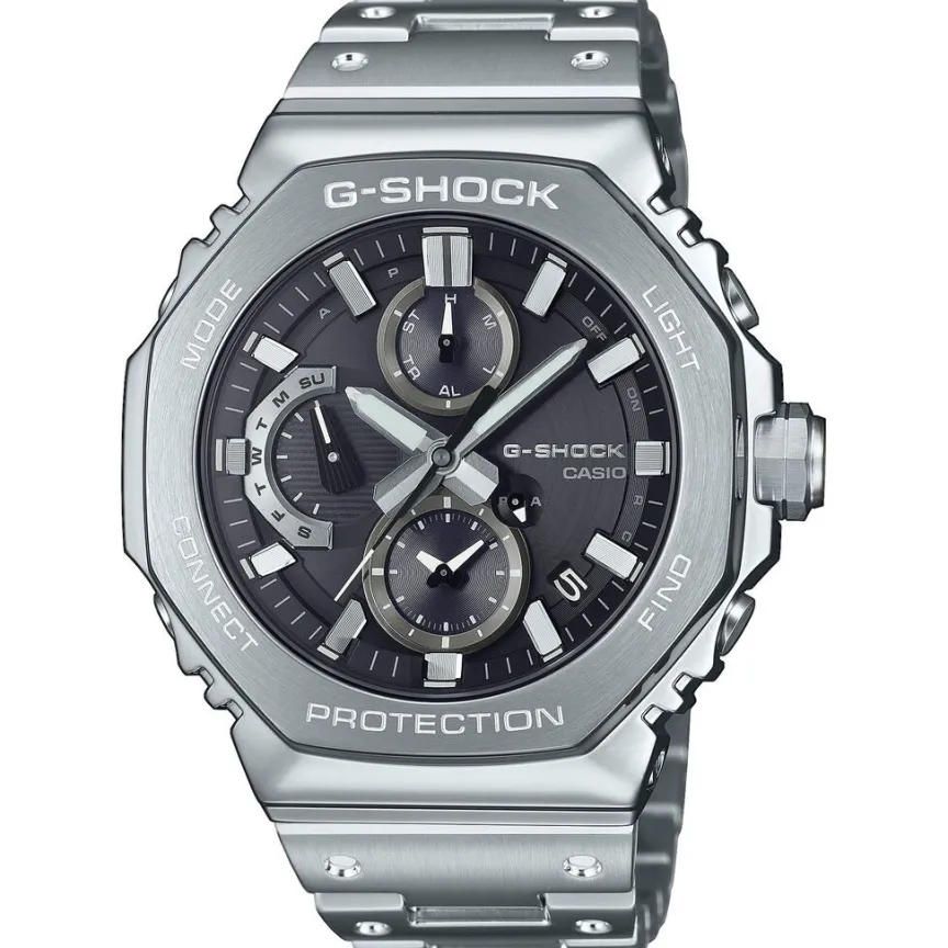 Montre Casio G-shock Premium Acier Argenté Ronde Quartz Solaire 46.3mm Multifonctions Fond Noir Bracelet Acier Argenté Gmc-b2100d-1aer