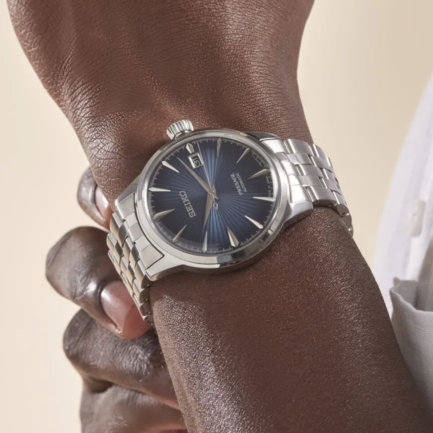 Montre Seiko Presage Cocktail Acier Blanc Ronde Automatique 40mm Fond Bleu Bracelet Acier Blanc Srpb41j1
