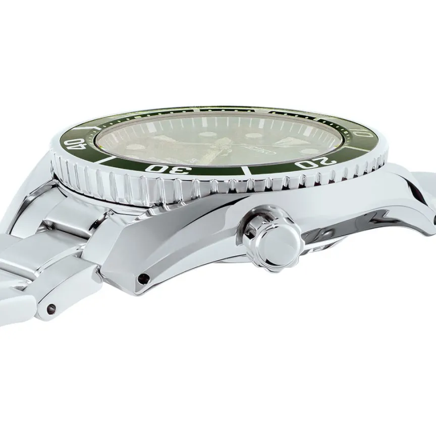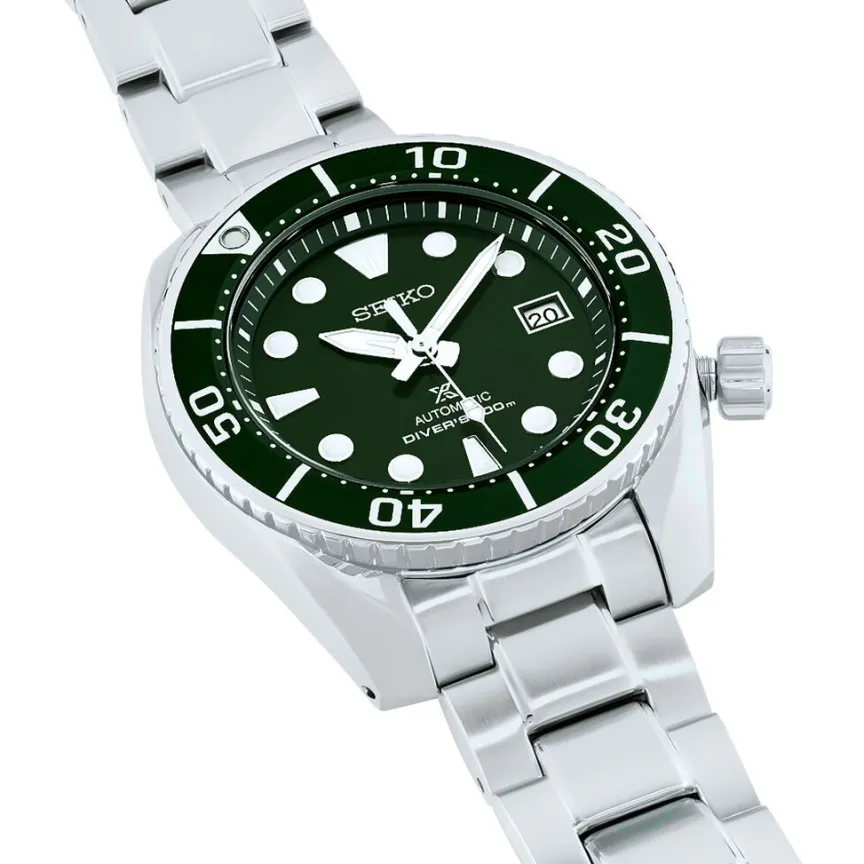 Montre Seiko Prospex Acier Blanc Ronde Quartz Automatique 45mm Fond Vert Bracelet Acier Blanc Spb103j1