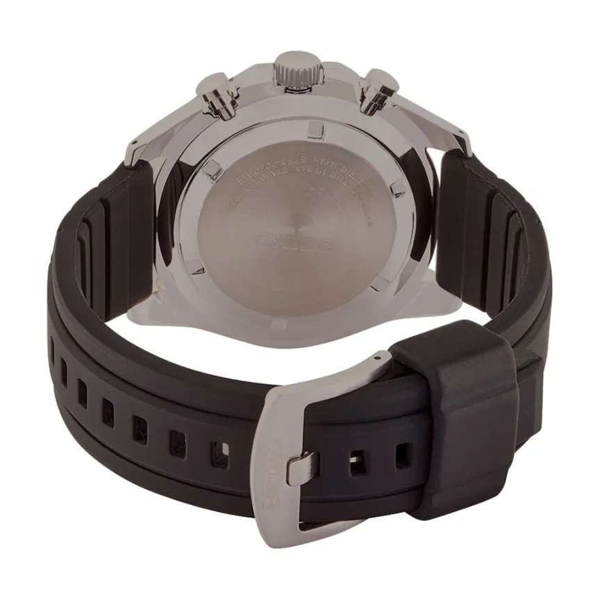 Montre Seiko Sport Acier Blanc Ronde Quartz Chronographe 43.9mm Fond Noir Bracelet Silicone Noir Ssb347p1
