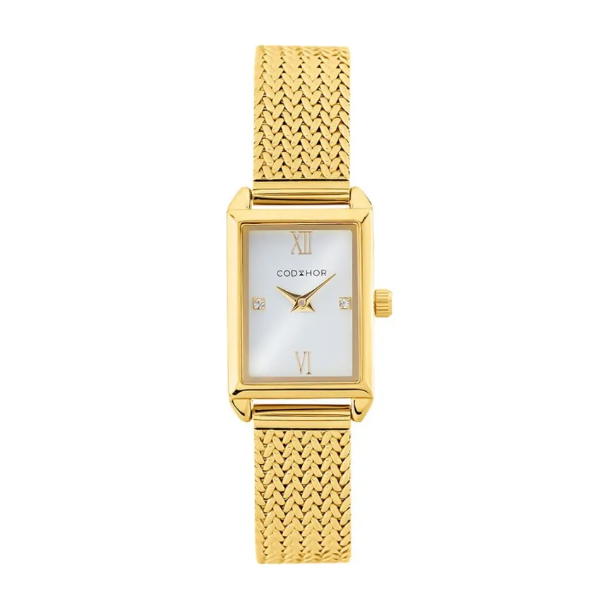 Montre Codhor Suzy Alliage Doré Rectangulaire Quartz 17.5×28.5mm Fond Blanc Bracelet Milanais Acier Doré P101073-b