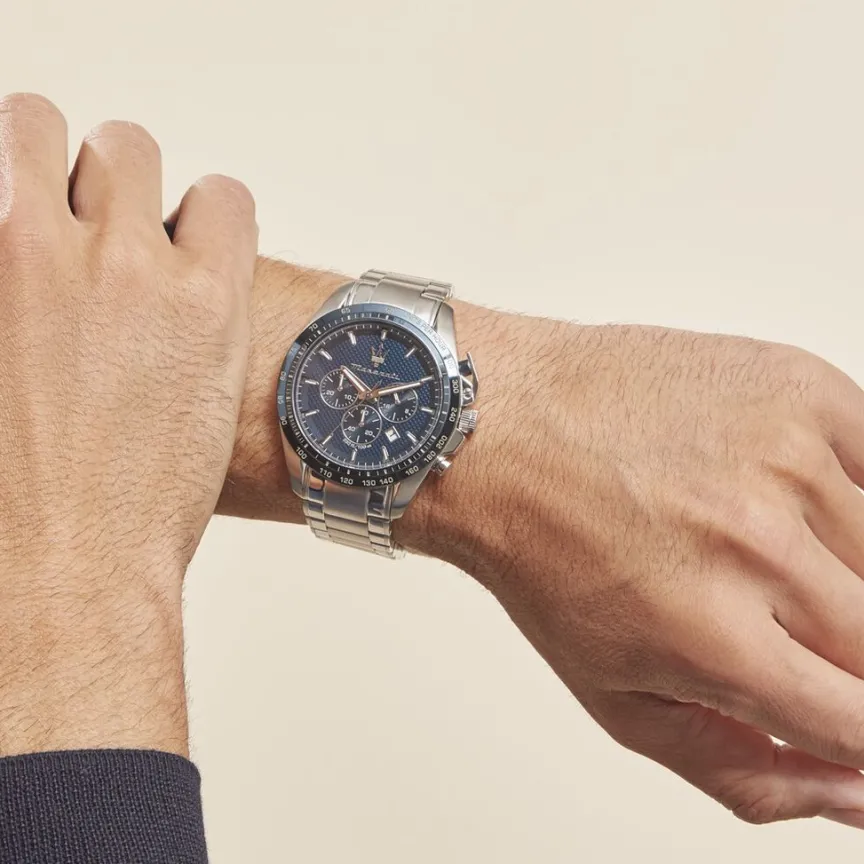 Montre Maserati Traguardo Acier Argenté Ronde Quartz Chronographe 45mm Fond Bleu Bracelet Métal Argenté R8873612043