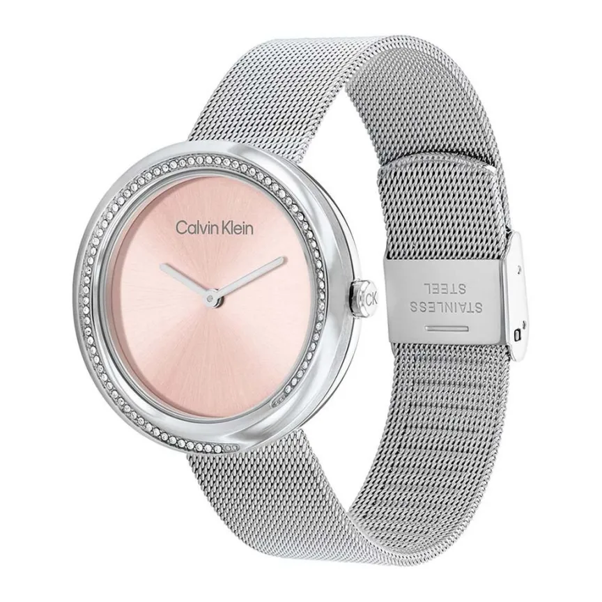 Montre Calvin Klein Twist Acier Blanc Ronde Quartz 34mm Fond Rose Lunette Strass Bracelet Acier Blanc Maille Milanaise 25200149