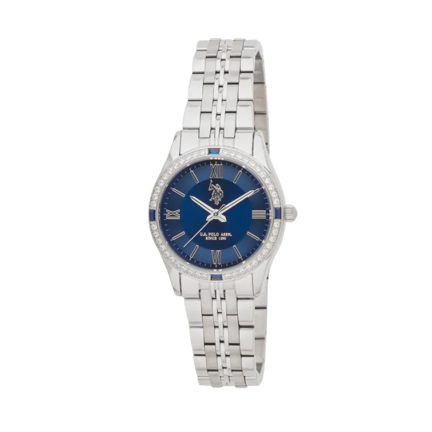 Montre U.S. Polo Alliage Argente Quartz Ronde 31Mm Fond Bleu Lunette Strass Bracelet Acier Argente