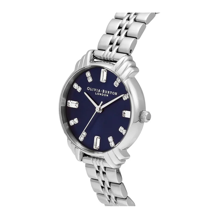 Montre Olivia Burton Art Deco Acier Argenté Ronde Quartz 30mm Fond Bleu Bracelet Acier Argenté Ob16dc01