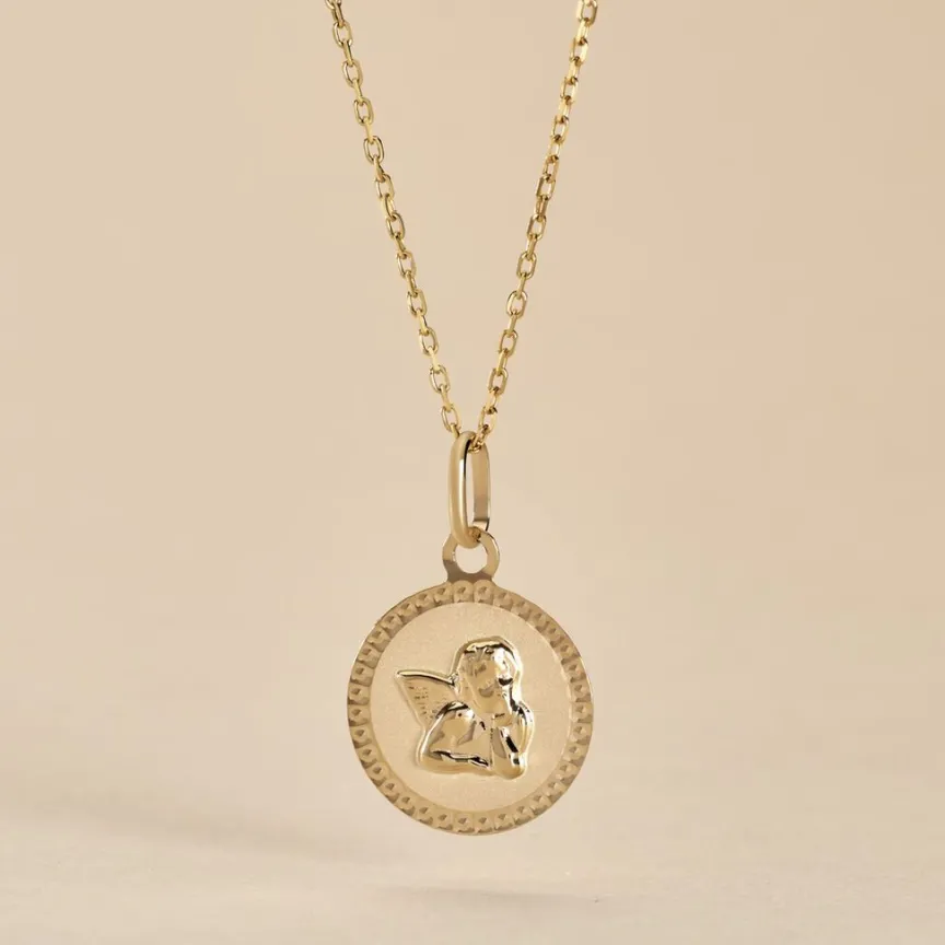 Pendentif Or Jaune 375/1000 Médaille Ronde Ciselée Brillant Motif Ange Penseur