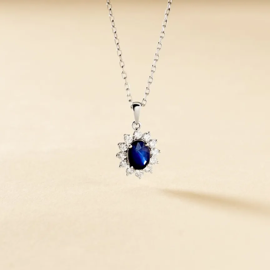 Pendentif Or Blanc 375/1000 Saphir Simple Entourage Diamants Gm